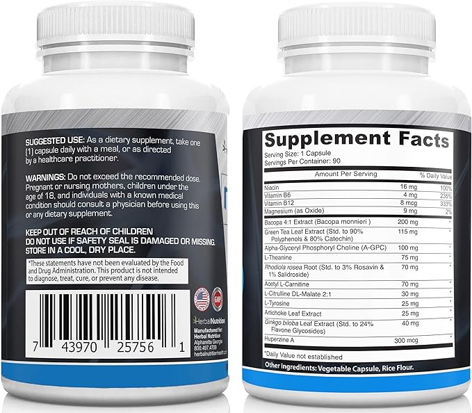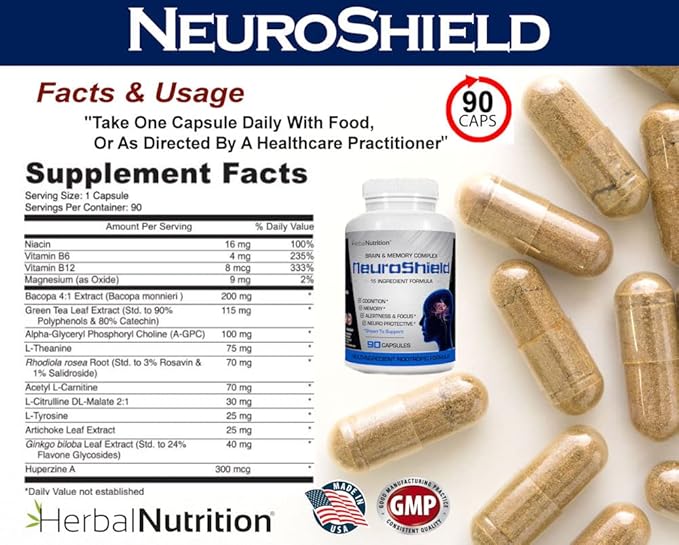 - Key Ingredients - Huperzine A, Bacopa Monnieri Ginkgo Biloba, Acetyl L-Carnitine, Rhodiola Root, L-theanine support enhanced cognition, memory, and promote blood flow and oxygen to the brain. Magnesium Oxide helps balance the brain, relieve stress and enhance mood.* L-theanine works with Green Tea Extract to provide non-jittery mental stimulation to promote energy and focus.* Making NeuroShield a great memory supplement for the brain. USA created and GMP manufactured to ensure quality.