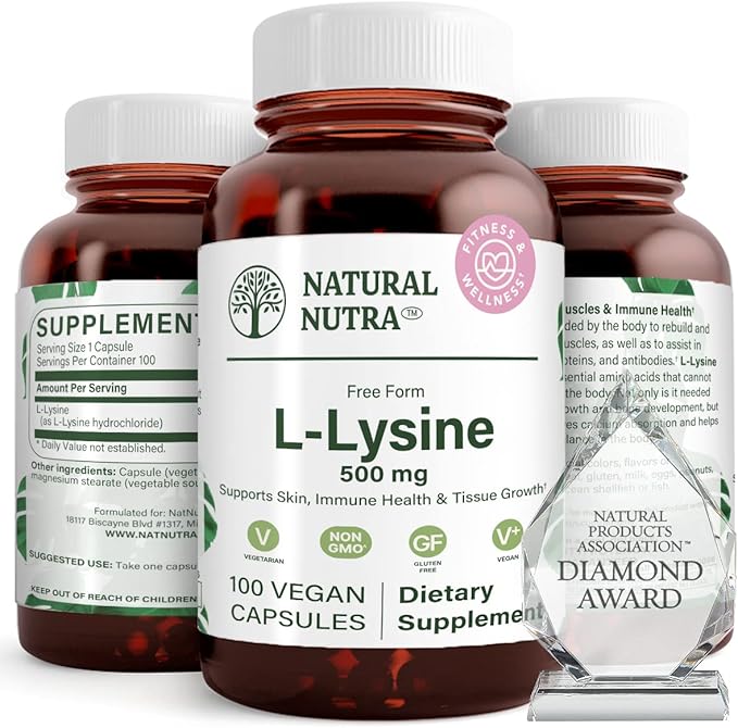 Natural Nutra L Lysine HCl, Promotes Bone Health and Growth, Support Skin Health, Improve Vitamin C Absorption, Helps Built Collagen, Improve Calcium Absorption, Non-GMO, Vegan, 500 mg, 100 Capsules.
