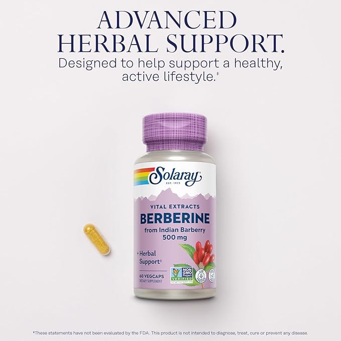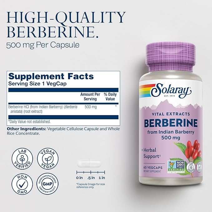 SOLARAY Berberine 500mg - Berberine Supplement for a Healthy, Active Lifestyle - with Berberine HCl from Indian Barberry - Vegan, Non-GMO, 60-Day Guarantee, Lab Verified - 60 Servings, 60 VegCaps