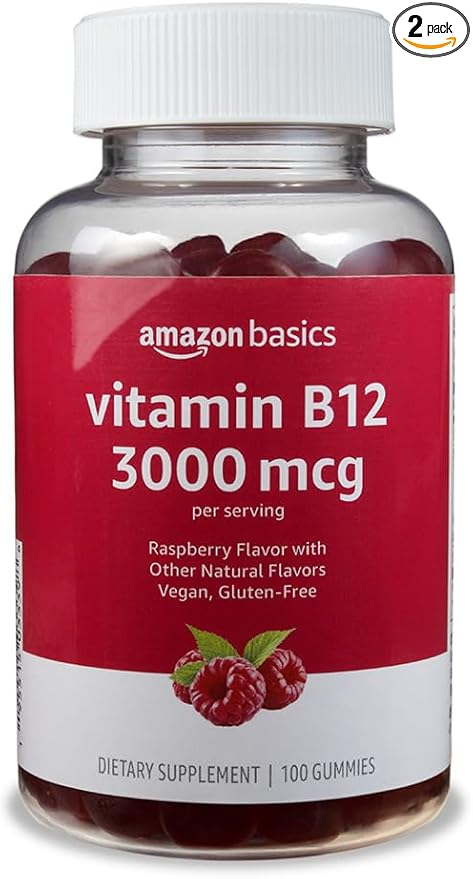 Amazon Basics Vitamin B12 3000 mcg Gummies, Normal Energy Production and Metabolism, Immune System Support, Raspberry, 200 Count (2 Packs of 100), 2 per serving