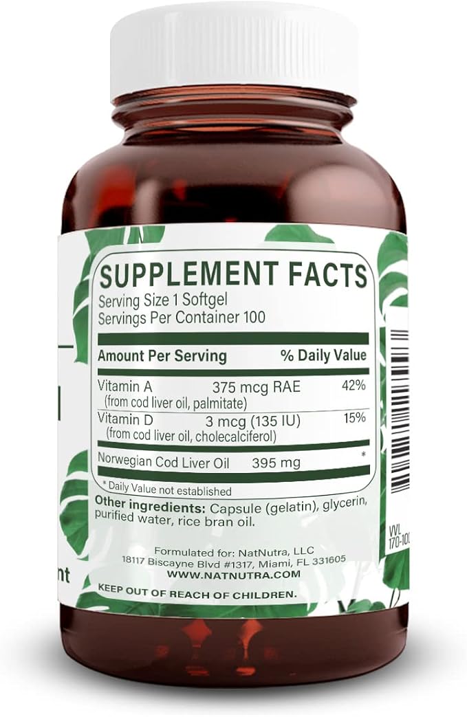 Natural Nutra Norwegian Cod Liver Oil Supplement, Helps to Maintain Skin, Helps Maintain Body Density, Eye Health & Nerve Function, Promotes Dental Health, Supports Cardiovascular Health, 100 Softgels