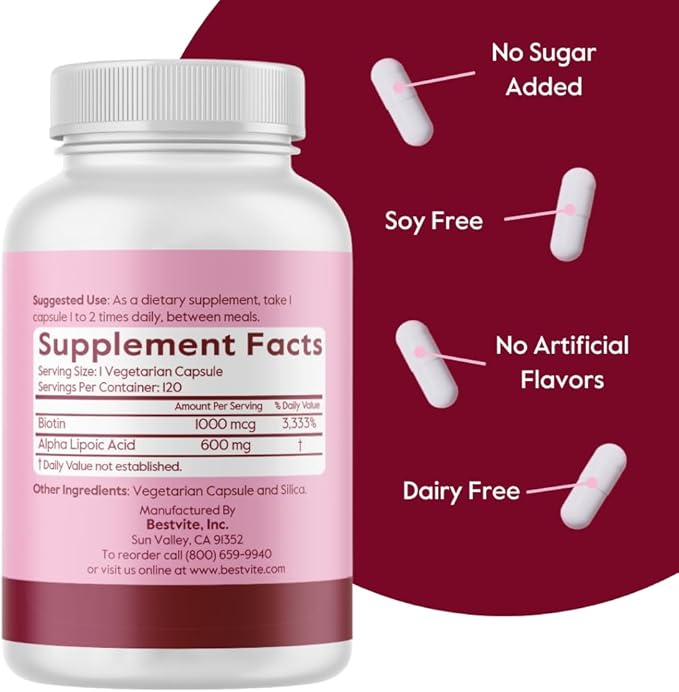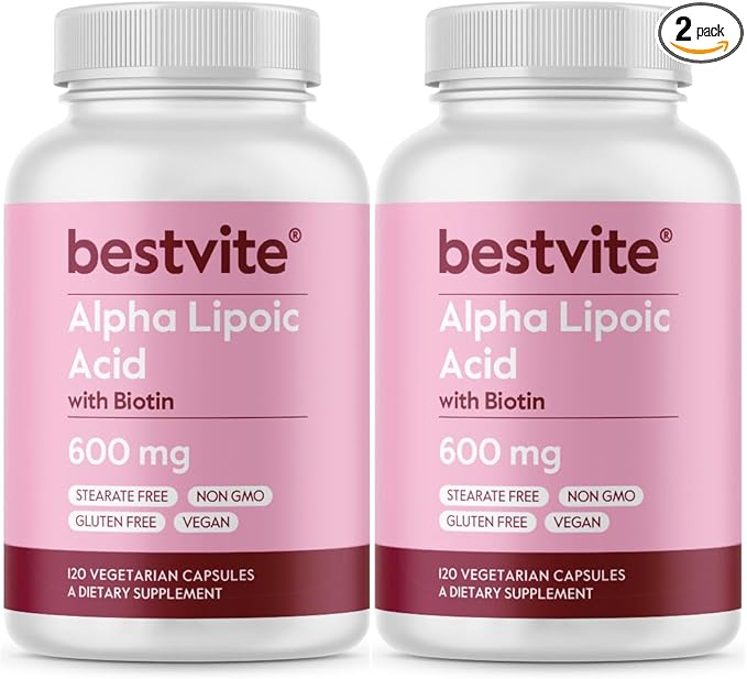 - PURE FORMULA: Bestvite Alpha Lipoic Acid contains no stearates, is non-GMO, gluten-free, and vegan. Each capsule contains 600 mg of Alpha Lipoic Acid and 1000mcg of Biotin.