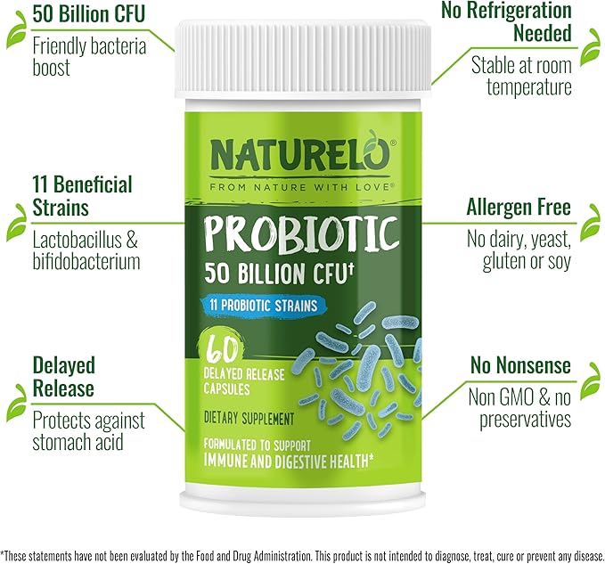 NATURELO Probiotics for Digestive Health - 50 Billion CFU, 11 Strains Daily Supplement - Boosts Immune System, Delayed Release, 60 Vegetarian Capsules