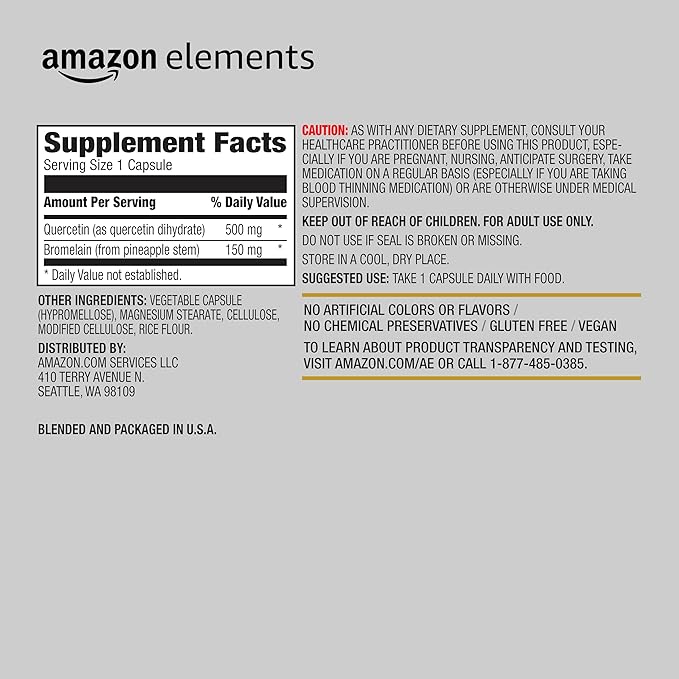 Amazon Elements Quercetin + Bromelain, 500 mg Quercetin with 150 mg Bromelain, Vegan, Pineapple, 50 Capsules