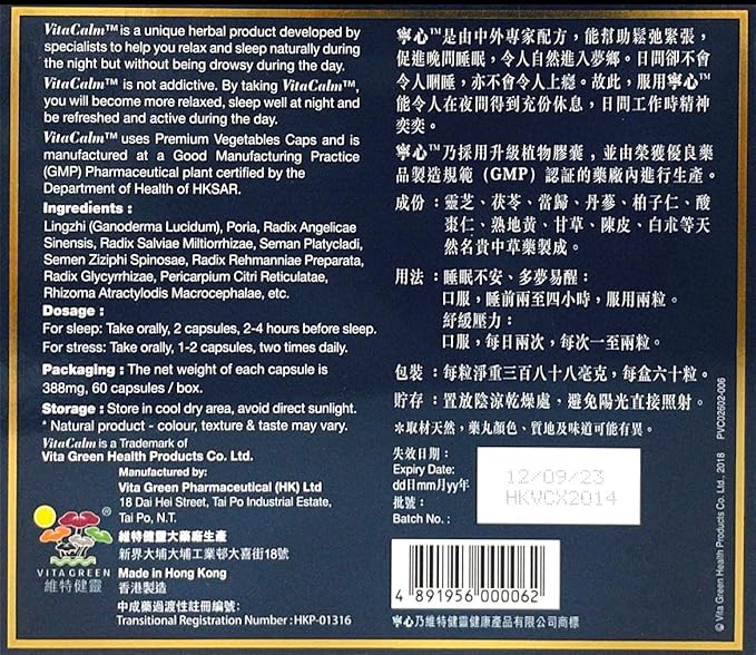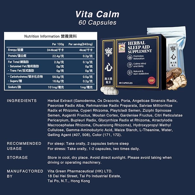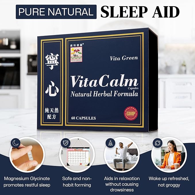 Vita Calm Sleep Aid – Natural Herbal Supplement with Lingzhi Mushrooms – Supports Relaxation and Better Sleep – Non-Addictive Formula for Stress Relief and Improved Sleep Quality – 60 Capsules