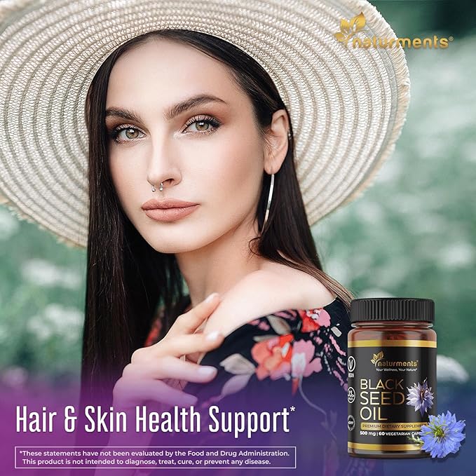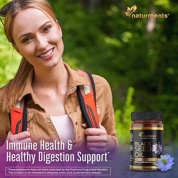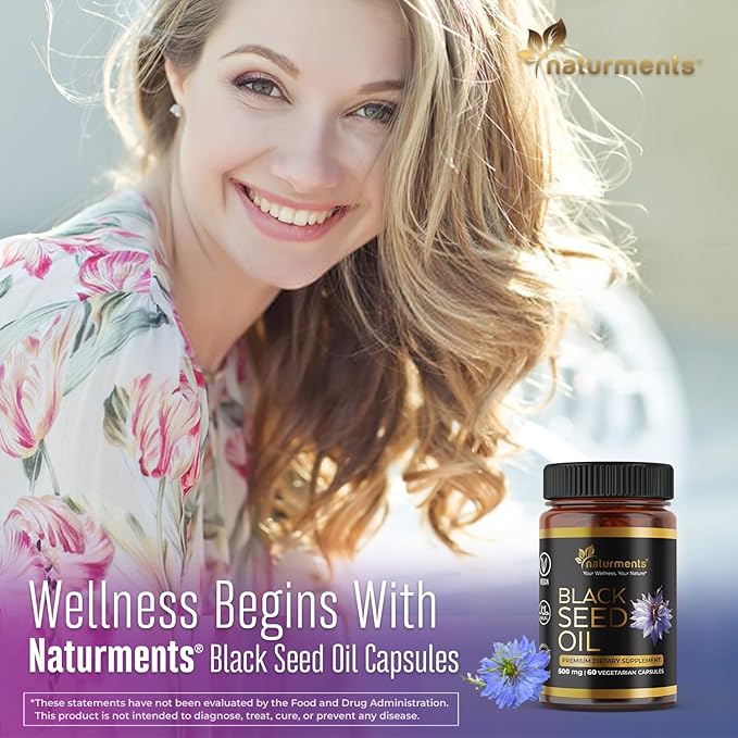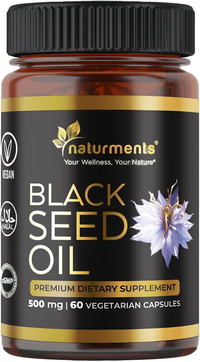 Naturments Premium Black Seed Oil Vegetarian Capsules 100% Organic Unrefined Non GMO Cold Pressed Extra Virgin Nigella Sativa Pure Halal Kalonji Oil - 60 Capsules (500 mg Each)