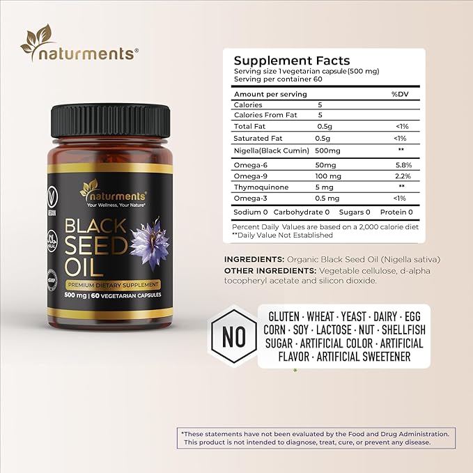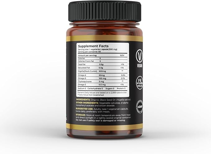 - 500 mg of Pure Black Seed Oil: Each vegetarian capsule contains 500 mg of cold-pressed Nigella Sativa oil.