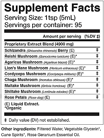 - Ingredients - Reishi (Ganoderma lucidum) Mushroom (E)*, Agaricus (Agaricus blazei) Mushroom (E)*, Lion's Mane (Hericum erinaceus) Mushroom (E)*, Cordyceps (Cordyceps militaris) Mushroom (E)*, Chaga (Inonotus oblicuus) Mushroom (E)*, Maitake (Grifola frondosa) Mushroom (E)*, Shiitake (Lentinula edodes) Mushroom (E)*, Schisandra (Schisandra chinensis) Berry (E)^, Rose (Rosa canina) Petals (E)^