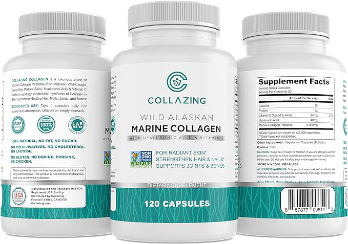 - RADIANT SKIN & HAIR: Infused with Hyaluronic Acid and Vitamin C, our Marine Collagen Capsules work synergistically to enhance hydration, elasticity, and overall skin tone, leaving you with a luminous complexion and fuller, healthier hair.