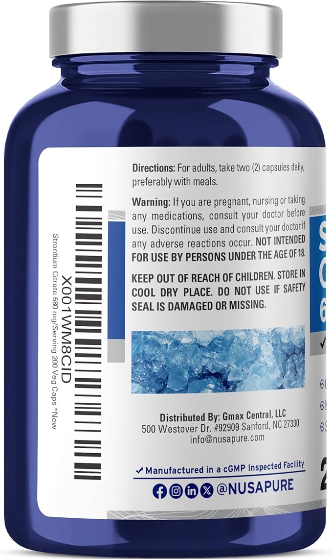 - Strontium Citrate 680 mg per serving 200 veggie caps for a 100-Day Supply