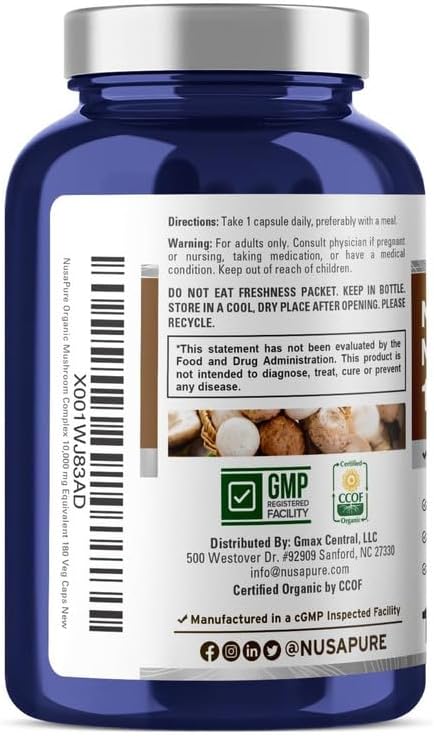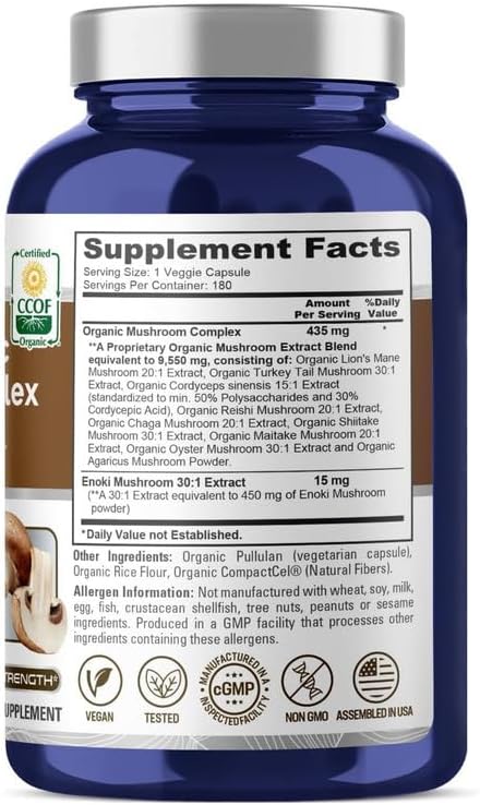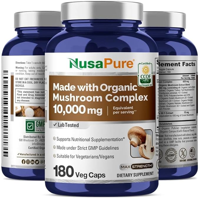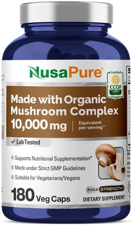 NusaPure Organic Mushroom Complex 10,000mg per Capsule, 180 Veggie Caps, Non-GMO, Enoki, Turkey Tail, Reishi, Chaga, Maitake