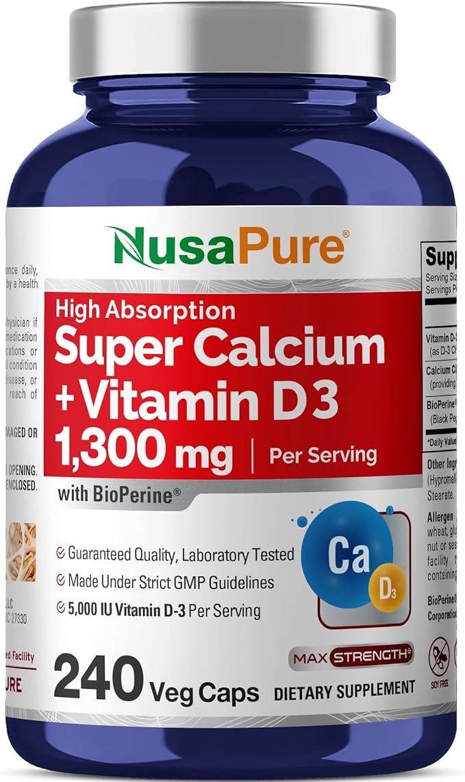 NusaPure Super Calcium 1300mg, Vitamin D3-240 Veggie Caps (Non-GMO, Soyfree, Bioperine)