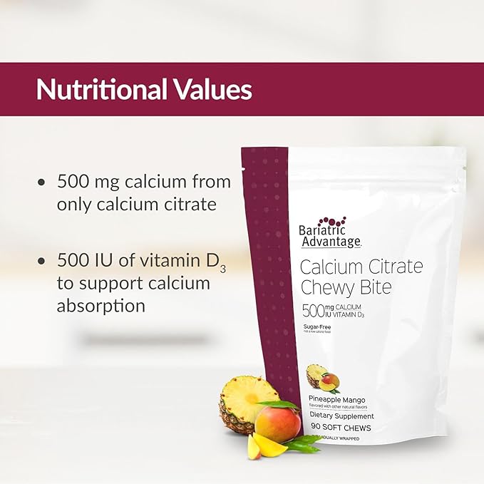 Bariatric Advantage Calcium Citrate Chewy Bites 500 mg - Highly Absorbable & Digestible - Vitamin D3 - Easily Chewable Calcium Supplement - Pineapple Mango - 90 Count