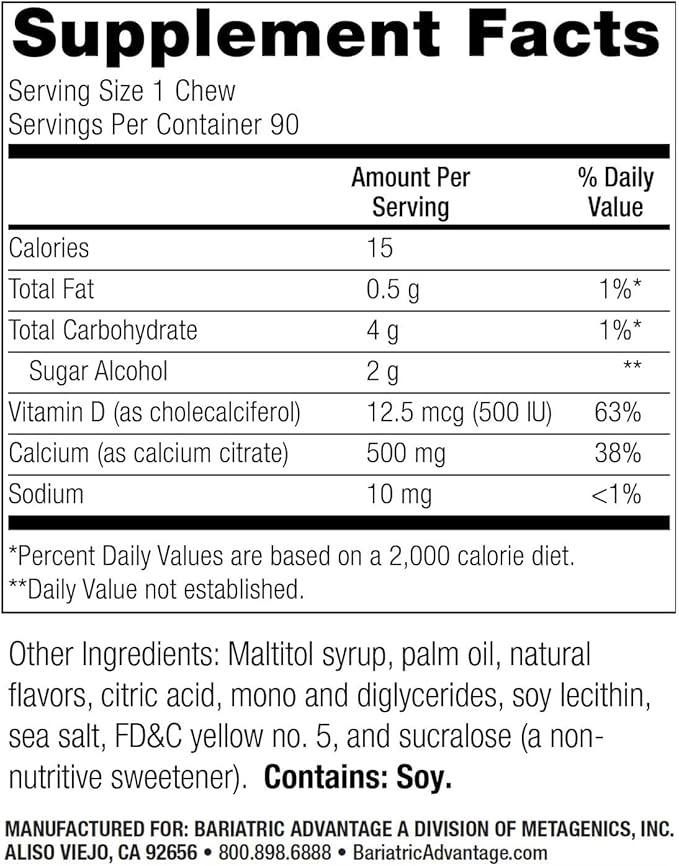 - Sugar-Free Chews: Each Bariatric Advantage chew is individually wrapped and sugar-free, making them easy to take on the go and an ideal choice for a chewable calcium supplement with no additional sugar content