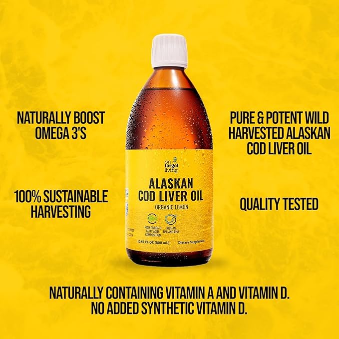On Target Living Alaskan Cod Liver Oil Liquid | Organic Lemon Flavor 16.67 oz | Line Caught in The USA | Naturally Occurring Vitamin D | Rich in Omega 3 DHA/EPA | Non-GMO Project Certified