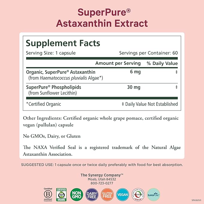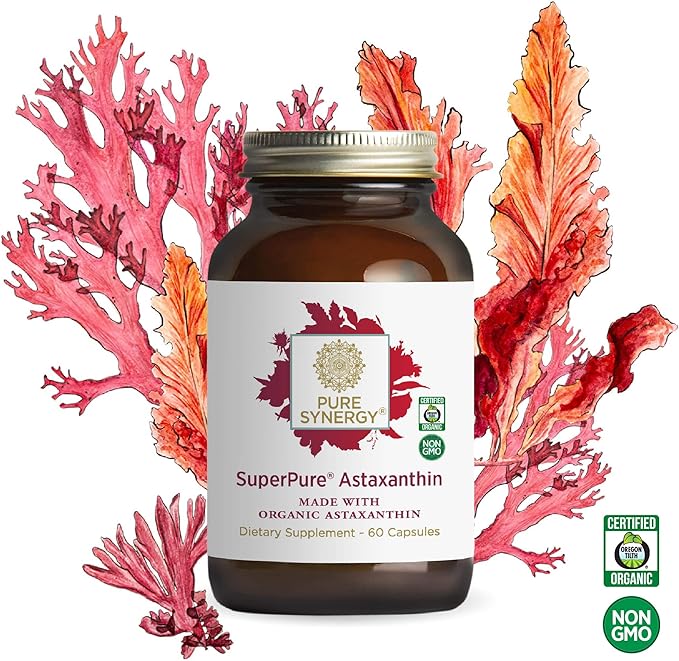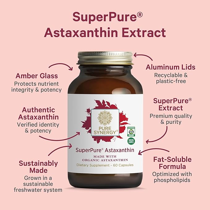 PURE SYNERGY SuperPure Astaxanthin Extract | Organic Astaxanthin from Algae with Sunflower Lecithin | Antioxidant Support for Skin and Eye Health (60 Capsules)