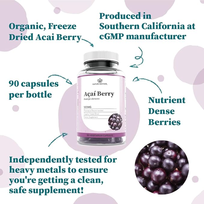 Nature Restore Organic Acai Berry Supplement, Freeze Dried, 90 Acai Berry Capsules, Non GMO, Gluten Free, Vegan