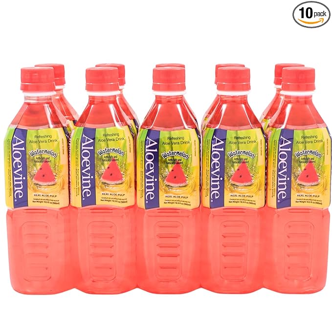 - WATERMELON DRINK:Aloevine Aloe Vera Drink watermelon-flavored beverage that contains real aloe vera pulp. It comes in a pack of 10 and each bottle is 16.9 oz. Refreshing and delicious drink.