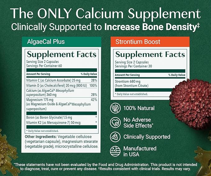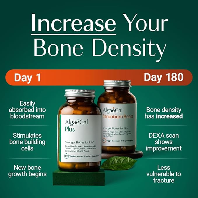 - Tested and Approved: The Bone Builder Pack is recommended by health experts to increase bone density safely and naturally. Take 2 AlgaeCal Plus capsules with breakfast or lunch, 2 with dinner, and 2 Strontium Boost capsules before bed, at least 2 hours apart from calcium. This clinically supported routine delivers 16 essential nutrients to promote stronger, healthier bones for life.