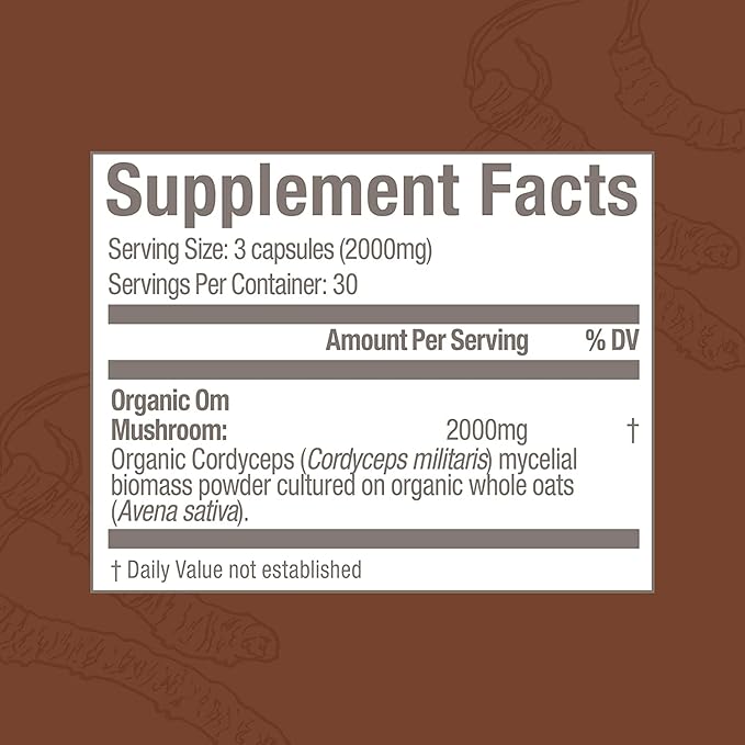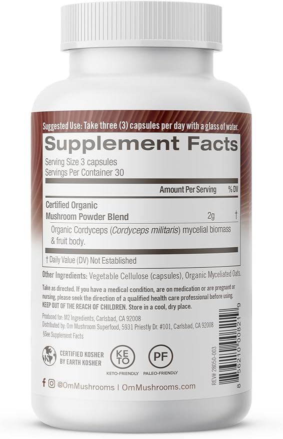 - Om Mushroom Superfood Cordyceps Organic Mushroom Powder: Contains 90 capsules (30 day supply) of 100% certified organic mushroom cordyceps militaris fruit body and mycelial biomass powder cultured on organic oats for energy, stamina and energy