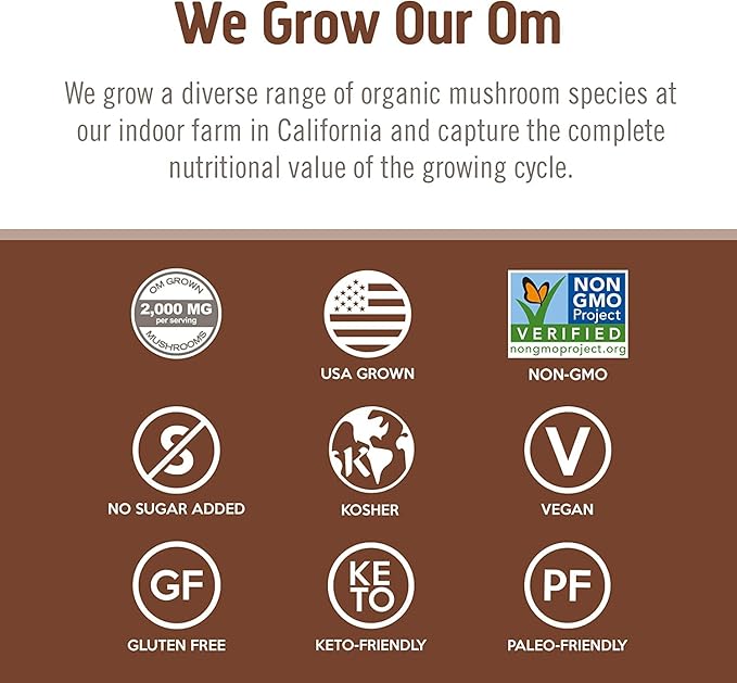 - USA Grown the Om Way: Om Mushroom Superfood Powders, Capsules, Hot Drinks, Energy Drinks and Broths are all produced in the USA. We grow, dry and mill our organic mushrooms into powders in our state of the art facilities in Southern California, to ensure the highest quality, and verify using 3rd-Party Testing. Om Mushroom capsules are non-GMO, gluten-free, vegan, grown in the USA, paleo-friendly, keto-friendly, kosher