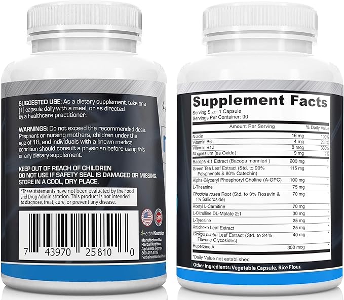 - Key Ingredients - Huperzine A, Bacopa Monnieri Ginkgo Biloba, Acetyl L-Carnitine, Rhodiola Root, L-theanine support enhanced cognition, memory, and promote blood flow and oxygen to the brain. Magnesium Oxide helps balance the brain, relieve stress and enhance mood.* L-theanine works with Green Tea Extract to provide non-jittery mental stimulation to promote energy and focus.* Making NeuroShield a great memory supplement for the brain. USA created and GMP manufactured to ensure quality.