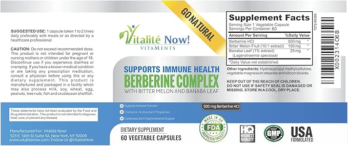 High Strength Berberine 500mg + Bitter Melon & Banaba - Immune System Health - Cardiovascular & Gastrointestinal Support - 60 Vegetarian Capsules