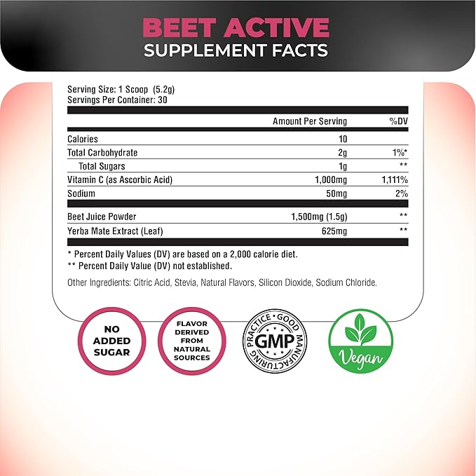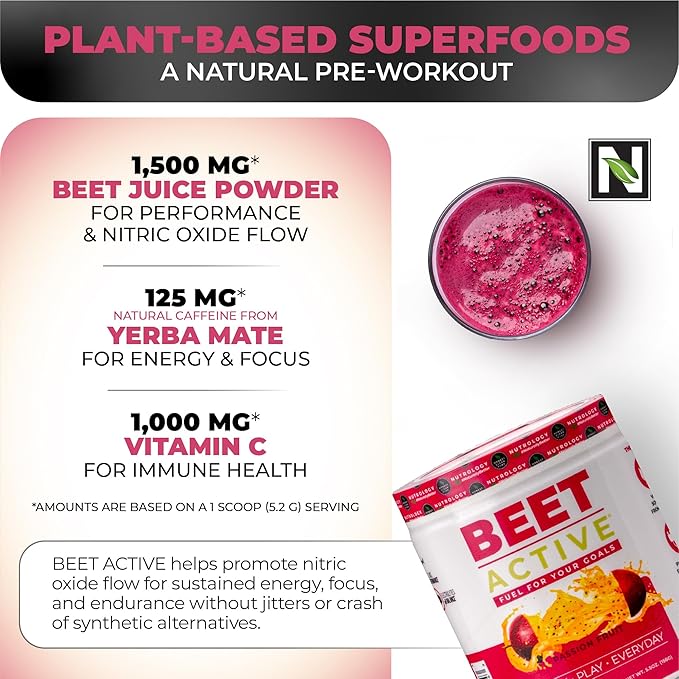- Clean Energy and Focus & Natural Nitric Oxide Booster: Beet Active pre workout powder offers a powerful blend of nature's finest - Beet Root supports natural stamina & nitric oxide flow helping oxygen-enriched blood reach muscles. Yerba Mate offers a bounty of antioxidants and polyphenols plus natural caffeine for a balanced energy boost.