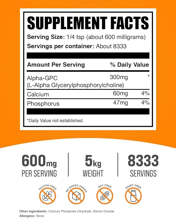 BulkSupplements.com Alpha GPC Powder - Choline Supplements, Alpha GPC 300mg - Acetylcholine Supplements, Unflavored & Gluten Free, 600mg per Serving, 5kg (11 lbs) (Pack of 5)