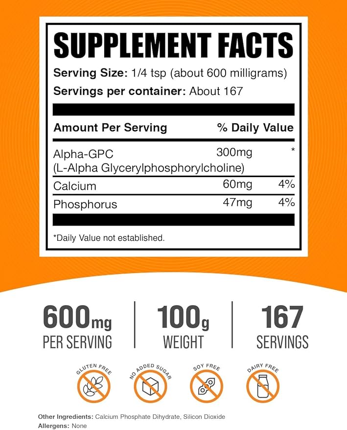 - Optimized in every Serving: Our Alpha GPC 300mg powder, one of choline supplements, is unflavored and free of unnecessary allergen like gluten & soy, offering you a high-quality product that easily integrates with other supplements or your preferred shake or beverage.