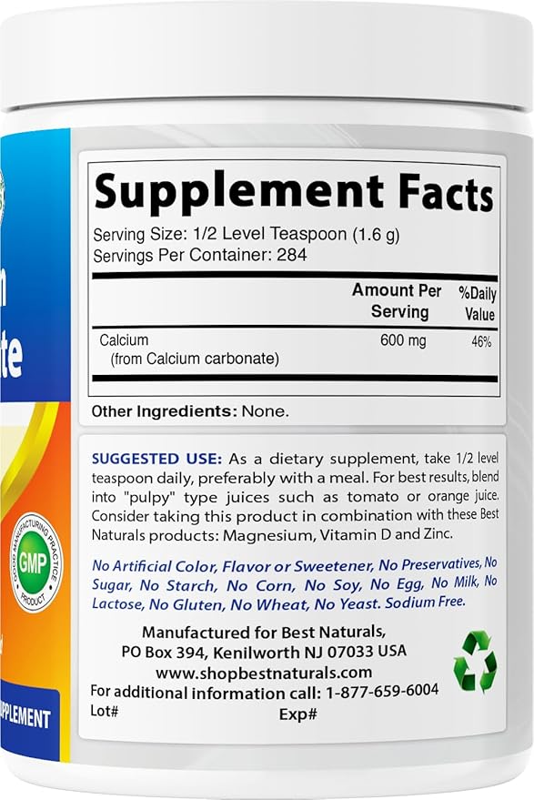 - ½ Level Teaspoon (1.6 g) of Calcium Carbonate per Serving, 284 Servings per bottle.