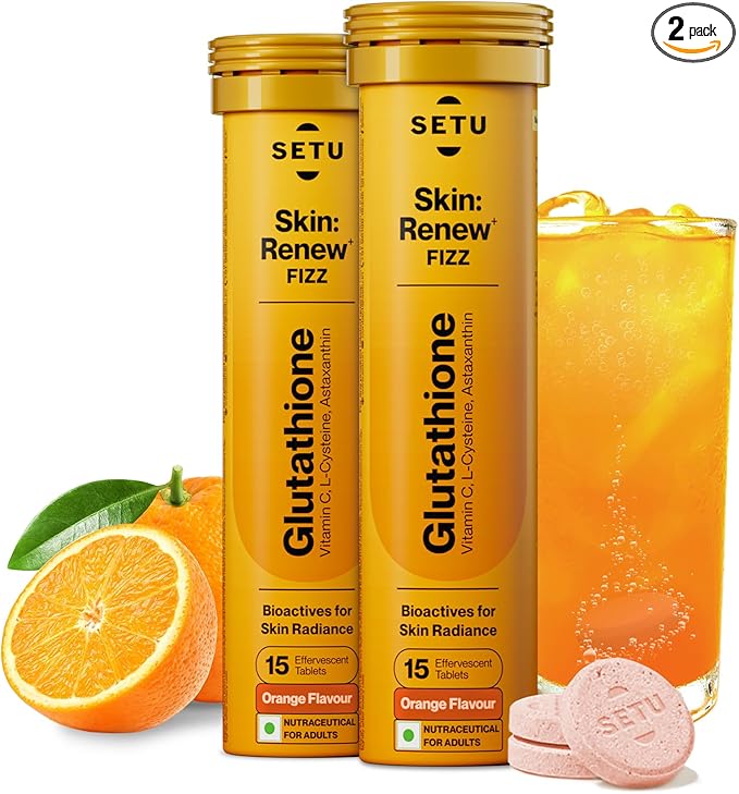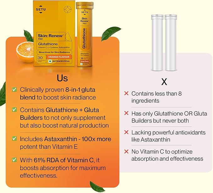 SETU Skin Renew, Glutathione with Vitamin C, Gluta Fizz, Supports Detoxification, Sugar-Free, Orange Flavour, 30 Effervescent Tablets