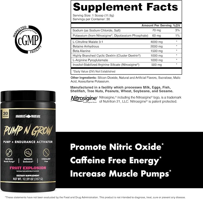 Anabolic Warfare Pump-N-Grow Muscle Pump Supplement Caffeine Free Pre Workout with L-Citrulline, L-Arginine, Beta-Alanine (Fruit Explosion– 30 Servings)