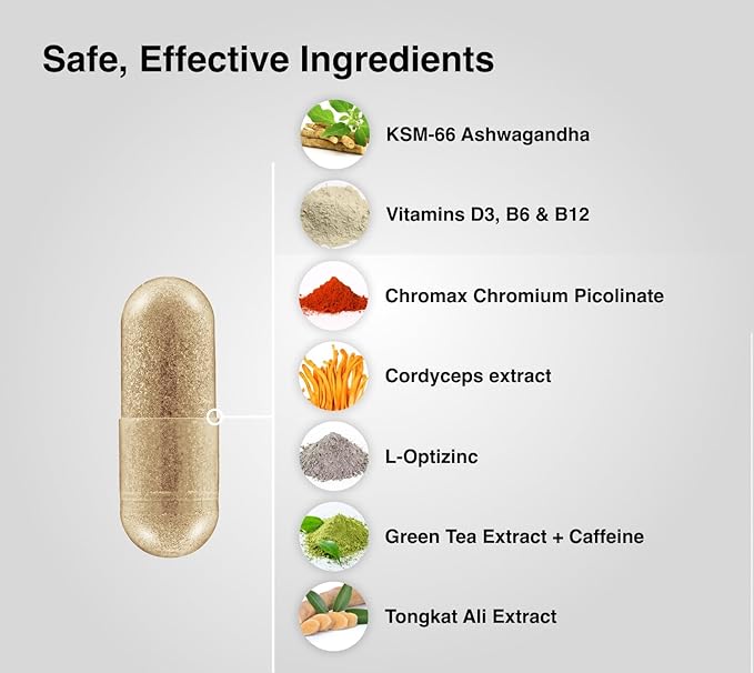 - Powerful Clinically Tested Ingredients, 600mg KSM-66 Ashwagandha, 200mcg Chromium (from Chromax), 15mg Zinc (from L-Optizinc), 5mg Bioperine, 100mg Advantra Z per serving