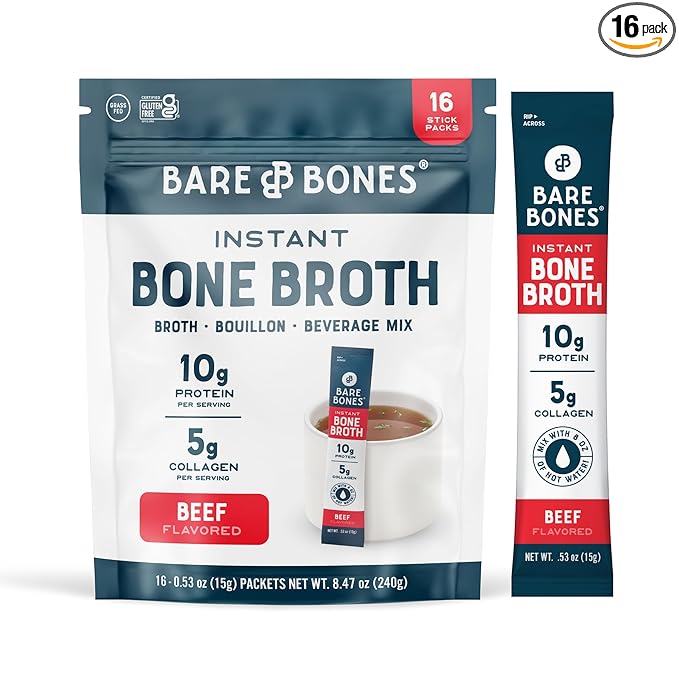 - AROMATIC DELICIOUS FLAVOR: Enjoy the taste and benefits of bone broth in convenient stick packs with Bare Bones Instant Beef Bone Broth. Made with real bone broth, beef collagen, freshly ground herbs and spices, and more. Experience the deep, rich, savory flavor of real bone broth, crafted with quality ingredients that warm you from the inside out, wherever you are.