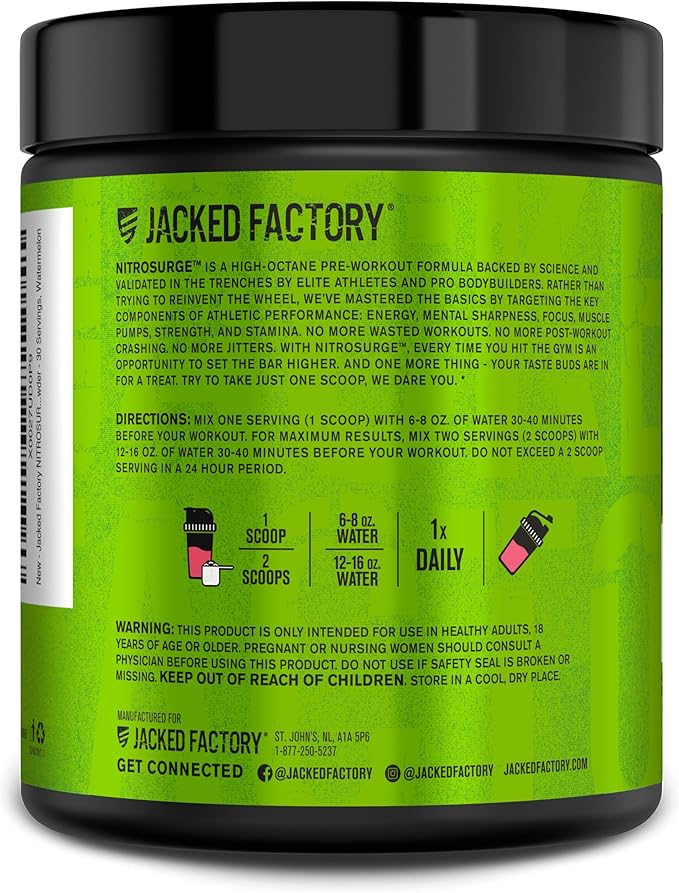 Jacked Factory NITROSURGE Pre Workout Supplement - Endless Energy, Instant Strength Gains, Clear Focus and Intense Pumps - NO Booster & Powerful Preworkout Energy Powder - 30 Servings, Watermelon