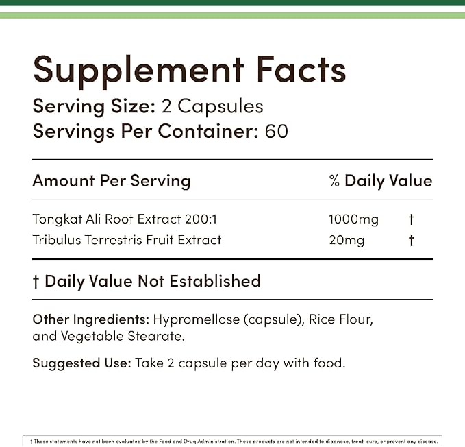 - TWO MONTH SUPPLY: Our Tongkat Ali / Tribulus complex has 60 servings (120 capsules). Enough to last a full two months