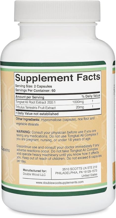Tongkat Ali - 1000mg (2 Month Supply) - Men's Health - 200:1 Extract of (Longjack) Eurycoma Longifolia, with 20mg Tribulus Terrestris (Third Party Tested) by Double Wood