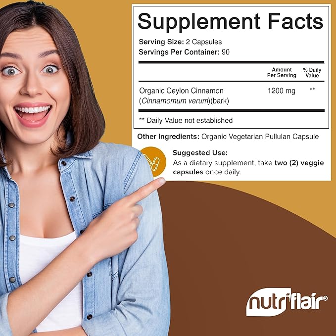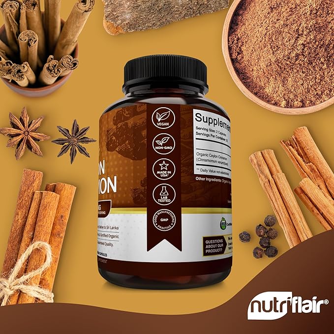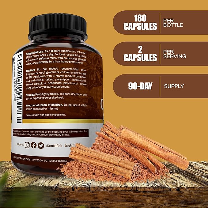 NutriFlair Organic Ceylon Cinnamon (100% Certified Organic Ceylon Cinnamon) 1200mg per Serving, 180 Capsules - Joints, Inflammatory, Antioxidant