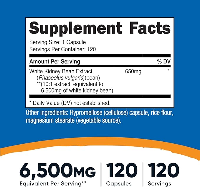 - 650mg of White Kidney Bean Extract (10:1) Per Serving. Equivalent to 6500mg of White Kidney Bean