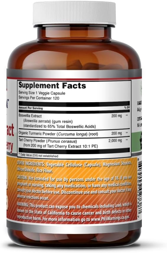 - Boswellia Extract 200 mg, Organic Turmeric Powder 200 mg, and Tart Cherry 2000 mg Per Serving Supplement