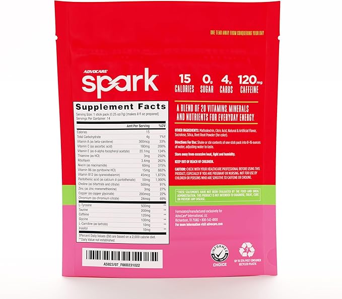 AdvoCare Spark Vitamin & Amino Acid Supplement - Focus & Energy Drink Powder Mix with Vitamin A, B-6, C & E - Also Includes L-Carnitine & L-Tyrosine - Strawberry, 14 Stick Packs