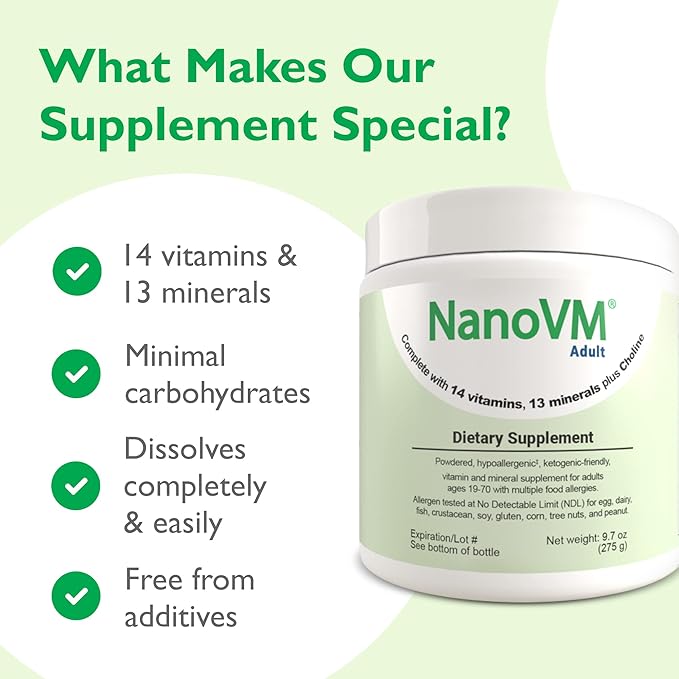- Allergen-Free Daily Vitamins - NanoVM Adult is a safe vitamin powder supplement for people aged 19-70 with food allergies and unique dietary requirements. Our vitamin supplements have no detectable limit for eggs, dairy, fish, crustaceans, soy, corn, tree nuts, and peanuts.
