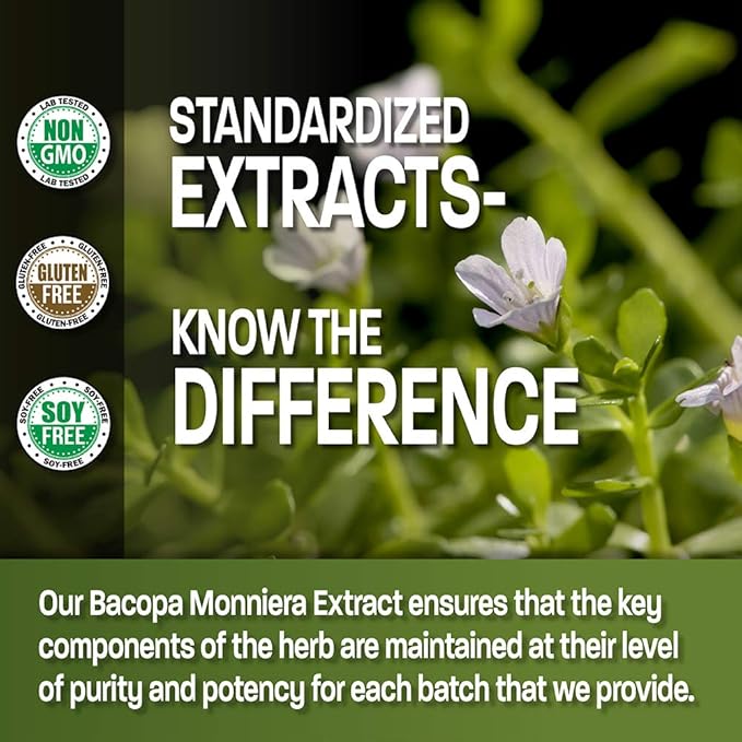 - Standardized Herb: Ensuring that the integrity of the herb is verified from batch to batch for quality and potency. Providing Bacopa Monniera Extract that is standardized to contain 10% beneficial Bacosides per vegetarian capsule.