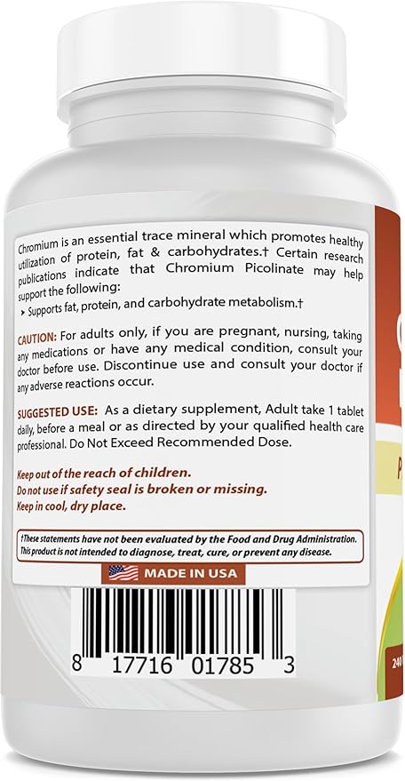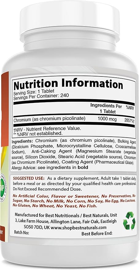 - 1000 mcg (1mg) of Chromium Picolinate per Tablet - 240 Tablets / Servings per bottle