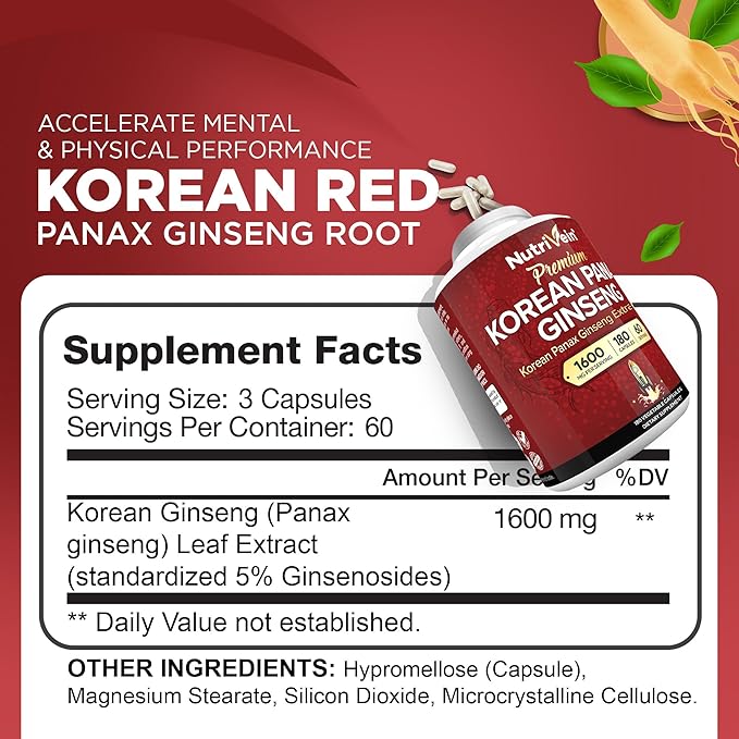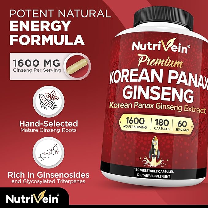 Nutrivein Korean Red Panax Ginseng 1600mg – Extra Strength Formula – 180 Capsules – Boost Energy, Mental Focus & Immune Health Naturally