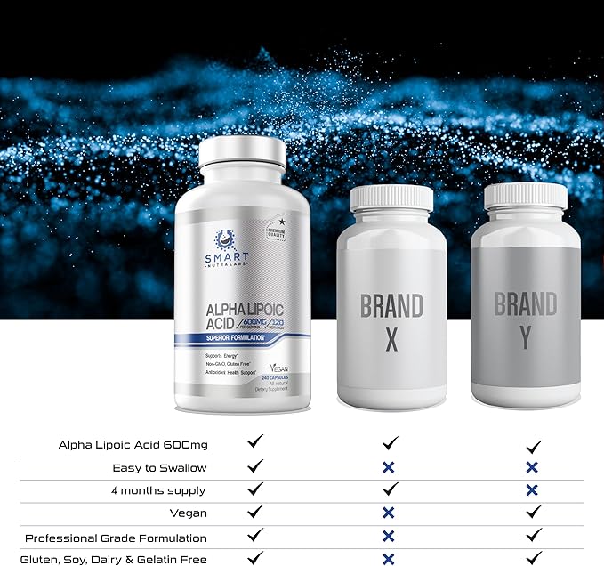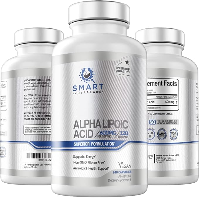 - Alpha lipoic acid; 600mg per serving, 240 vegan capsules, 4 months supply