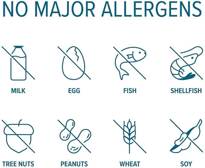 - Free from: Eggs, fish, gluten, GMO, milk, peanuts, shellfish, soy, tree nuts, wheat, artificial colors, artificial flavors, and artificial preservatives