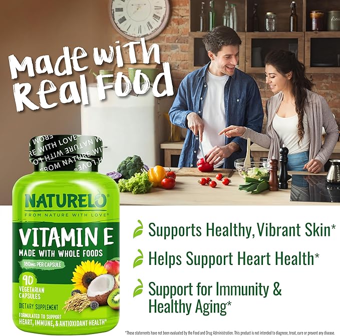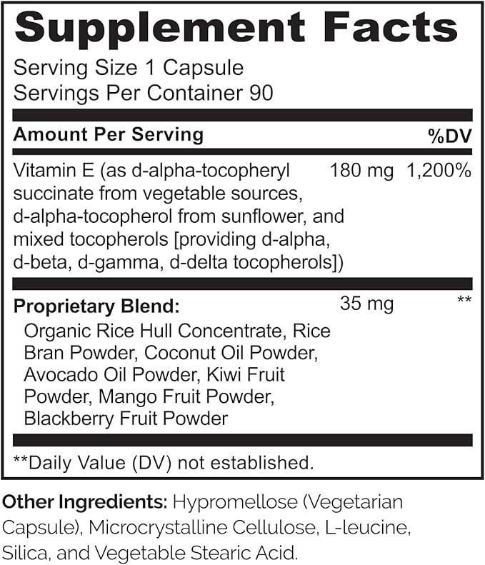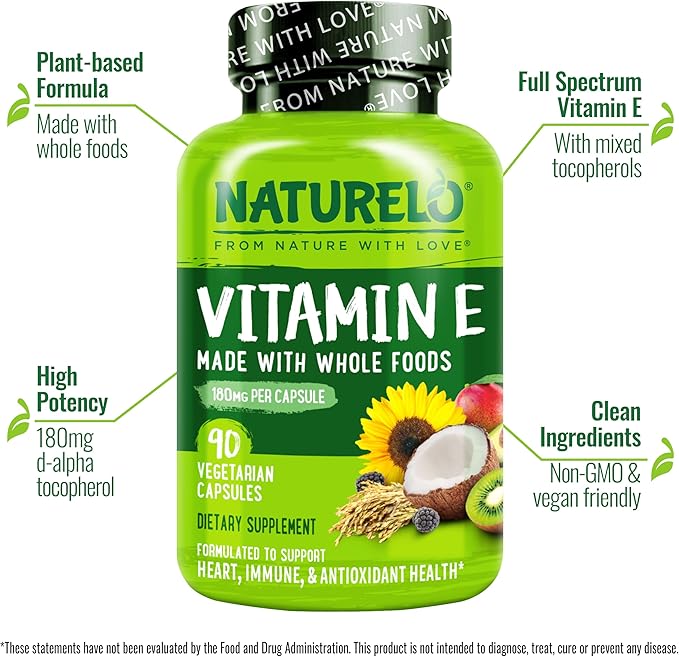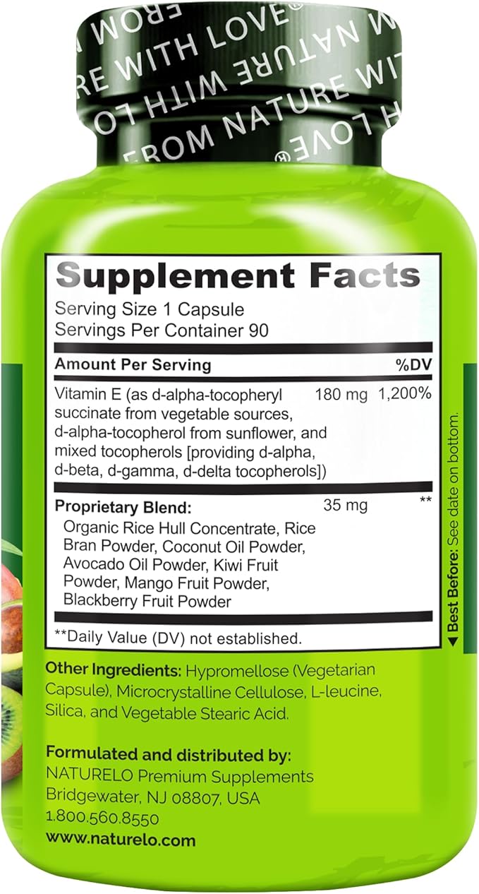 - NATURAL VITAMIN E: Formulated to provide the natural form of Vitamin E from vegetable sources and sunflower plus a blend of whole foods that typically contain naturally-occurring vitamin E including coconut oil, rice bran, avocado oil, mango and kiwi. Natural vitamin E is up to 3 times better absorbed than the synthetic version.*