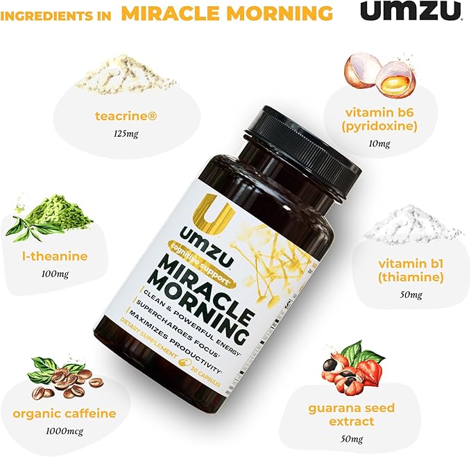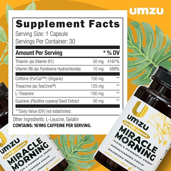 UMZU Miracle Morning Energy Supplement with Caffeine & Energy Enhancers | 150mg of Caffeine Supports All Day Focus, Productivity & Mood (30 Day Supply | 30 Capsules)